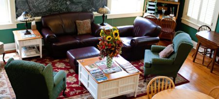 None of our 3 small lodging properties are fully ADA compliant, but we make every effort to accommodate guests with physical limitations. Please call us with your specific needs. The School House Inn building, listed on the National Register of Historic Places, has steps required to enter the building and a 23-step staircase to the second floor Common Room (no elevator) where guest breakfast is served. However, for Inn guests with difficulty climbing the staircase, we can serve an in-room breakfast tray to a first floor guest room. Inn room bathrooms are not wheelchair accessible. Our Clark Street Lodge building does have a ramp to the entry porch and its first floor Cottage unit has 36” doorways; however, the bathroom and kitchen facilities are not wheelchair accessible. Both guest rooms in the Dormitory House are on the first floor with only two steps required to enter the building; however bathrooms are not wheelchair accessible.